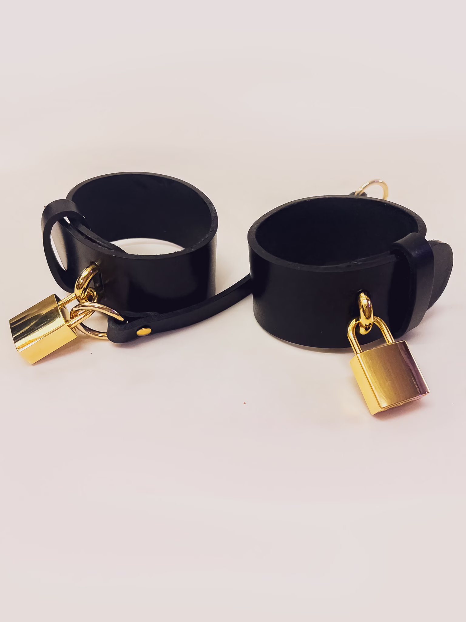 These cuffs are designed for both play and fashion, offering versatility in every wear. Fastened with small padlocks around the wrist, each set comes with two miniature keys for your convenience.